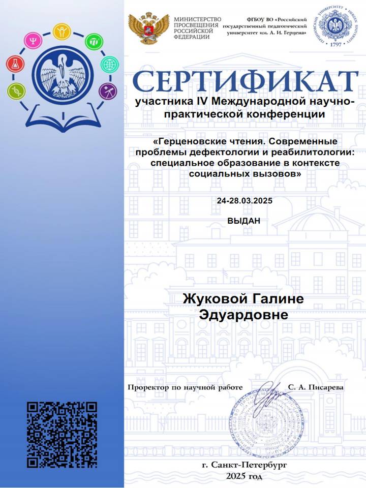 Сертификат участника IV Международной научно-практической конференции «Герценовские чтения. Современные проблемы дефектологии и реабилитологии: специальное образование в контексте социальных вызовов», март 2025г.