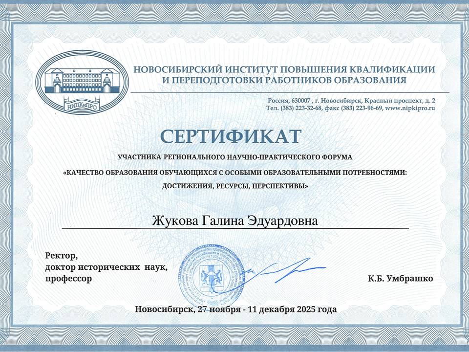 Сертификат участника регионального научно-практического форума "Качество обучающихся с особыми образовательными потребностями: достижения, ресурсы, перспективы", г. Новосибирск, НИПКиПРО , 27.11.2025 - 11.12.2025 г.